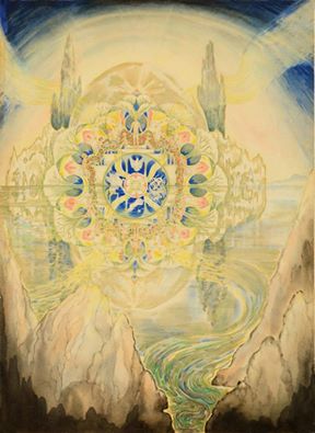 /MSB called this mandala "The Temple Where the Streams Meet." She wrote about the process: "About half way through it I discovered that it had a great deal of connection with Kubla Khan. It is nearly done, and just now I am sick of the sight of it. Still I feel better for having done it in spite of my disappointment in it – a month from now I may not think it is as bad as I do at present." It's a beautiful painting of course, but she could never acknowledge her own gift.